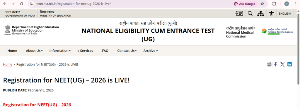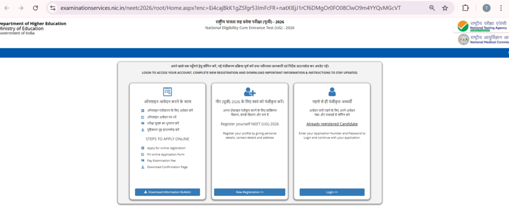 फिर आपको Registration for NEET (UG)-2026 is LIVE! पर क्लिक करना होगा | क्लिक करने के बाद ये इंटरफ़ेस देखने को मिलेगा |